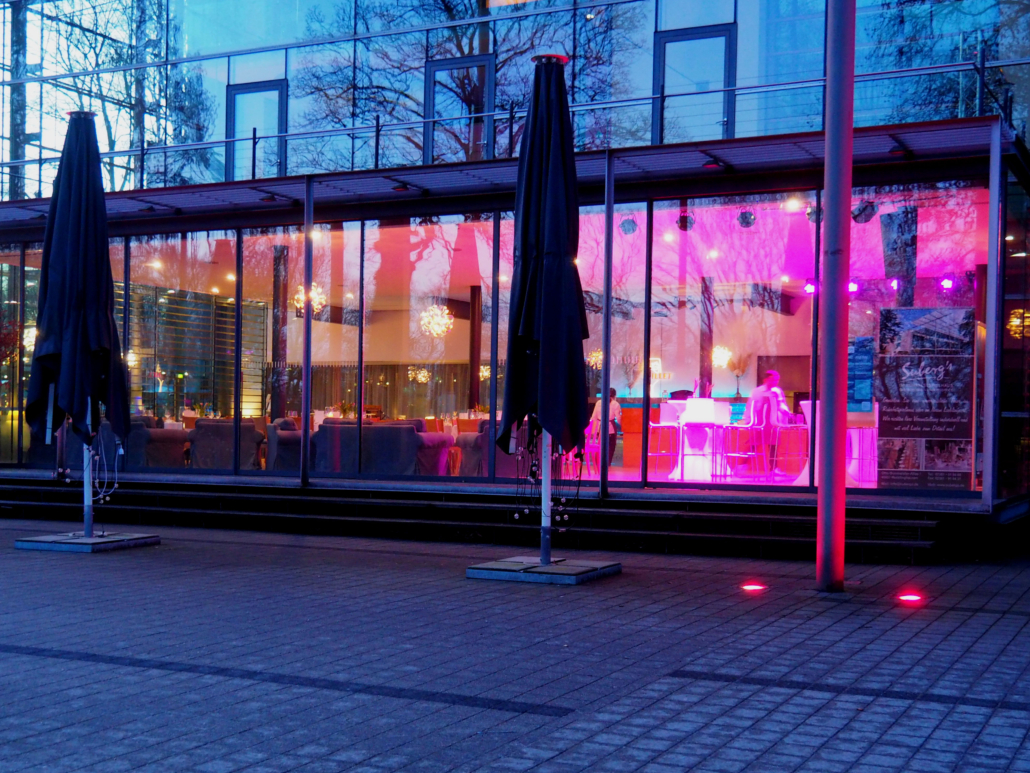 Im Inneren erwartete uns ein modern gestalteter Saal mit stilvoll arrangierten Tischen, warmen Lichtakzenten und einem offenen Blick durch die großflächigen Panoramascheiben. Die besondere Lichtinszenierung verlieh dem Abend eine elegante, fast schon künstlerische Note – ganz im Charakter des Hauses.