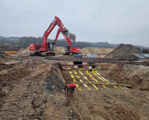 Neben klassischen Erd- und Rohrbaumaßnahmen kamen auch technisch anspruchsvolle Bauverfahren wie Bohr- und Durchpressarbeiten zum Einsatz. Durch die Weitläufigkeit des Geländes entstanden wechselnde Arbeitsorte, die je nach Baufortschritt eingerichtet, verlegt und neu erschlossen werden mussten.